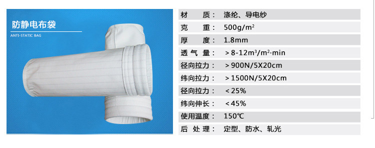 滌綸防靜電針刺氈濾袋:可分為兩種,一種是在滌綸針刺氈的基布中加入導電紗制成條紋防靜電除塵布袋;另一種是在濾布纖維面層中加入一定配比導電纖維(碳纖維)制成滌綸混導電針刺氈除塵布袋。兩者都具有良好的抗靜電能力,技術參數(shù)均可達到下列標準: